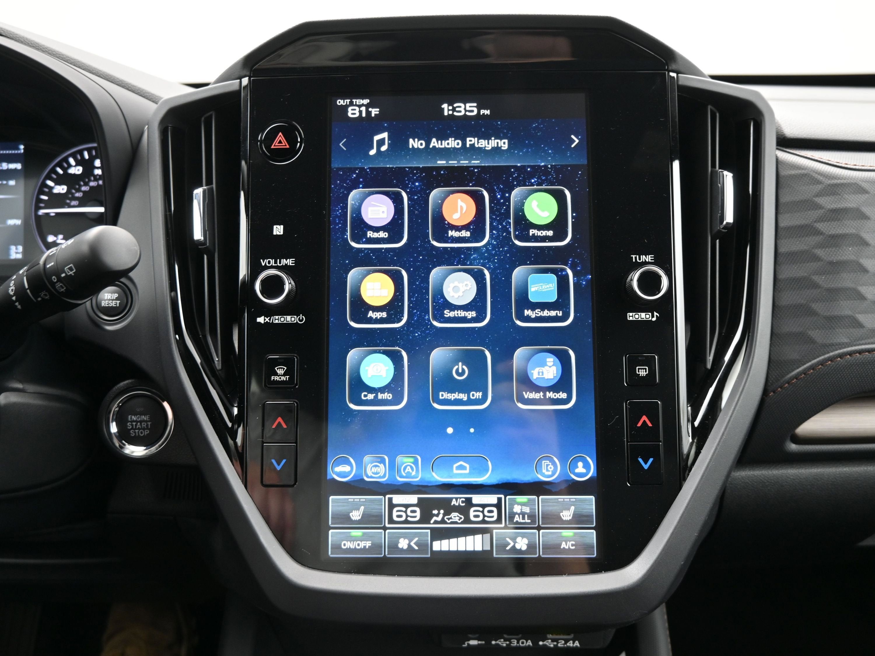 - Radio: Subaru 11.6" Multimedia Plus System -inc: valet mode, integrated center information display, AM/FM stereo HD Radio, multi-touch gesture high resolution display screen, voice activated controls, Bluetooth® audio streaming and hands-free phone connectivity w/SMS text messaging (refer to Subaru.com for cellphone compatibility), iPod control capability, smartphone integration: Android Auto and Apple CarPlay w/full screen view and wireless connection, SiriusXM satellite radio w/360L (free 4-month trial subscription included), USB and Over The Air (OTA) audio system update, steering wheel controls, 6 speakers, 3.5mm auxiliary input jack and roof mounted audio and satellite antenna